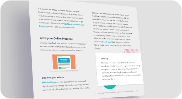 is in front of the largest audience possible is to get generates new leads, and grows your customer insight. listed on local and national business directories. (Here’s The blog posts you write should be approachable and a tip, the majority of national directories pull from local attainable. It should be clear that a friendly human is ones, so the first step towards a national listing is to get blogging for your company, not a keyword spewing listed locally.) Almost half (49%) of businesses listed on robot. Additionally, your blog posts should offer genuine Google get over 1,000 searches per month. value to your audience. When a customer trusts your blog to provide valuable information and helpful insight to your industry, they will keep coming back for more. Grow your Online Presence When you are brainstorming blog posts, start a quick voice or video call from Slack. Sometimes, a face-to- One you have built your website, created enticing social face or verbal conversation can help get the creativity media accounts, and registered your business on online flowing. directories it is time to expand your online footprint. Bonus Tip Whenever you have a particularly lovely customer experience in real life, share the experience on your blog or through a customer testimonial. Potential customers trust companies who they know others trust as well, Blog from your website. don’t hesitate to repurpose your customer encounters to Effective blogging is the backbone of any successful attract new clients. digital marketing strategy. When done correctly and with an eye on SEO, blogging from your website drives traffic, A handy guide we created with help from our friends at Slack. | 10