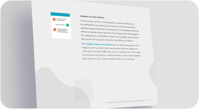 Integrate live chat software. In order to waste no time connecting with your website visitors, add a live chat feature to your site so you can convert new leads and provide customer support in real time. The inclusion of live chat software can be the difference between a new customer and a lost opportunity. By integrating a live chat feature you will be able to interact with potential customers when they are the most engaged— right when they click on your website. With HubSpot’s free live chat software you can easily customize your chat widget to match your brand and create targeted welcome messages for each page of your site. Additionally, every conversation gets automatically stored in your inbox with the customer’s timeline, so your digital marketing team can have a clear customer profile from just one conversation. A handy guide we created with help from our friends at Slack. | 13