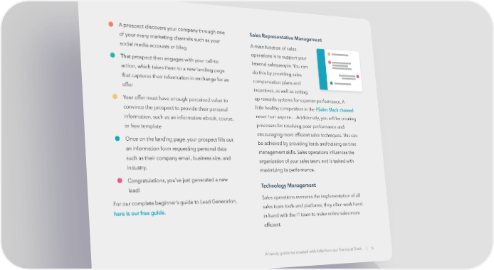 • A prospect discovers your company through one Sales Representative Management of your many marketing channels such as your A main function of sales social media accounts or blog operations is to support your • That prospect then engages with your call-to- internal salespeople. You can action, which takes them to a new landing page do this by providing sales that captures their information in exchange for an compensation plans and offer incentives, as well as setting • Your offer must have enough perceived value to up rewards systems for superior performance. A convince the prospect to provide their personal little healthy competition in the #Sales Slack channel information, such as an informative ebook, course, never hurt anyone… Additionally, you will be creating or free template processes for resolving poor performance and • Once on the landing page, your prospect fills out encouraging more efficient sales techniques. This can an information form requesting personal data be achieved by providing leads and training on time such as their company email, business size, and management skills. Sales operations influences the industry. organization of your sales team, and is tasked with maximizing its performance. • Congratulations, you’ve just generated a new lead! Technology Management For our complete beginner’s guide to Lead Generation, Sales operations oversees the implementation of all here is our free guide. sales team tools and platforms, they often work hand- in-hand with the IT team to make online sales more efficient. A handy guide we created with help from our friends at Slack. | 16